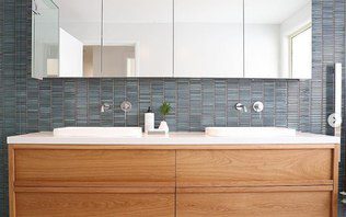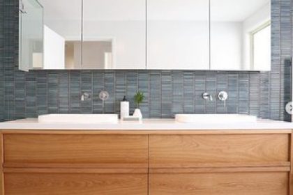 Acima da pia – Relembre o banheiro da casa dos seus avós. Consegue visualizar um módulo acima do gabinete, composto por um armário embutido com espelho e já com espaço destinado à escova de dentes? Esse conceito voltou mais moderno e atualizado, excelente escolha para que deseja mais aproveitamento do espaço. Normalmente, sua instalação inicia-se à 30cm da bancada (depende da altura da sua torneira), possui profundidade de 12cm (margem de segurança para você não bater a cabeça) e sua altura dependerá da composição desejada, podendo ir até o teto.