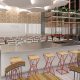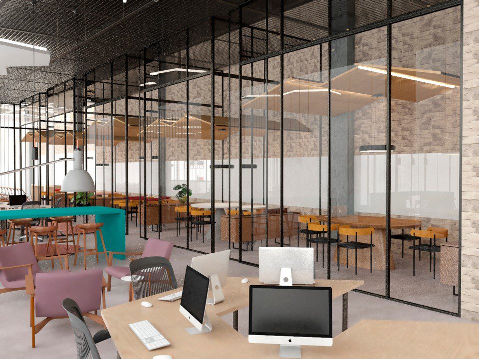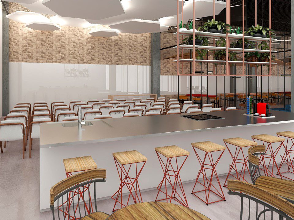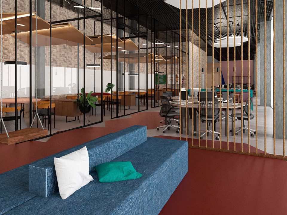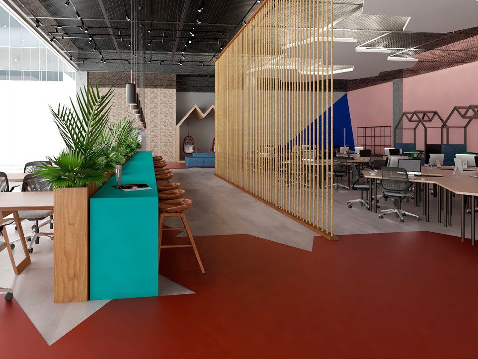 Aproveitando do estilo geométrico hexagonal, criamos movimento no ambiente, fugindo dos espaços convencionais e retos. Nosso foco foi encontrar o equilíbrio entre o carisma do lugar, as vibrações das cores e a escolha dos móveis, exatamente para atingir o público que busca construir ideias e que são amantes de design.
