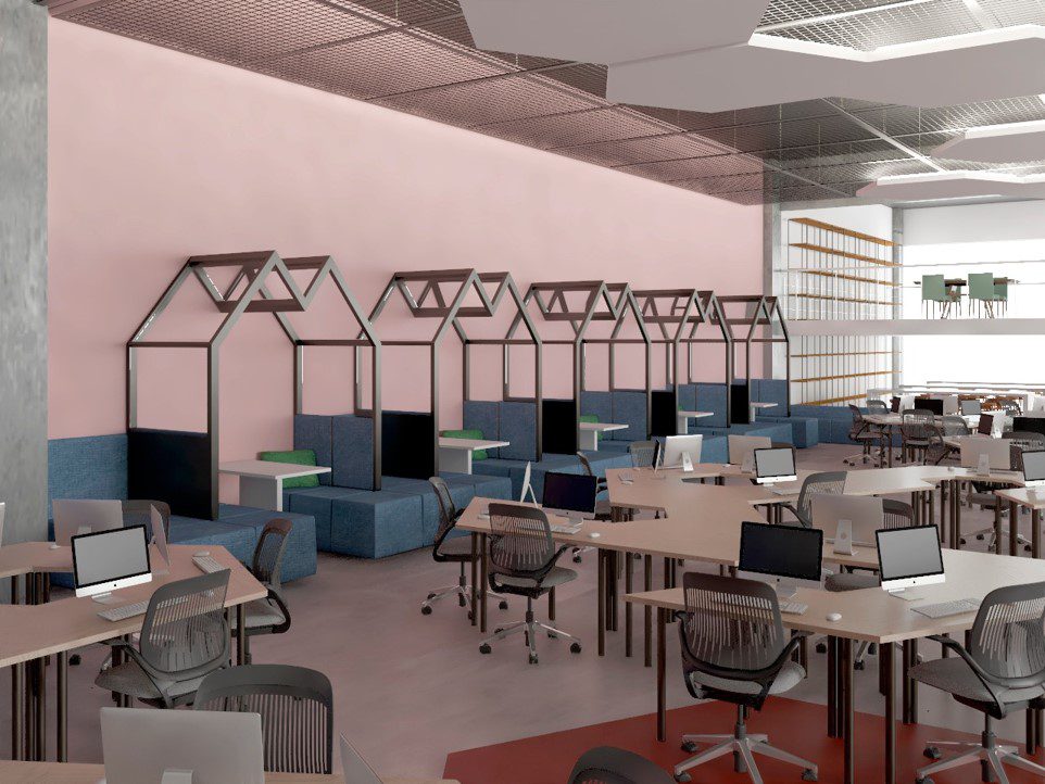 Em 2019, fomos finalistas em um concurso promovido pela Archademy para desenvolver um espaço compartilhado – coworking - para arquitetos e designers na Zona Norte de São Paulo. O ponto de partida, um shopping da região focado no setor de decoração, nos deu diretrizes para segmentar o layout encaixando perfeitamente as diversas solicitações do programa: mesas compartilhadas, espaços de descompressão, reuniões abertas e informais, reuniões fechadas, local para amostras e espaço para eventos.